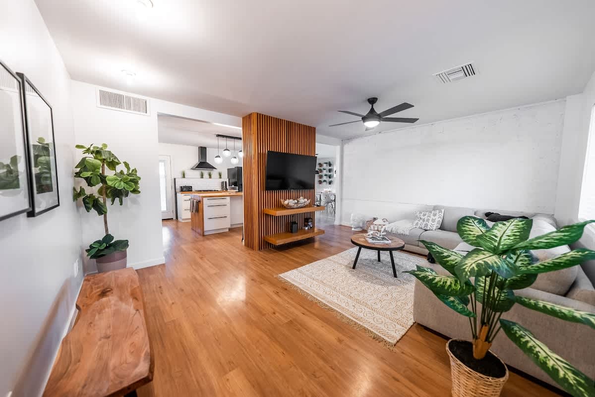 Our centrally located home in the heart of Scottsdale is a Tulum-themed retreat! Your home away from home is ideal for families, friends, or business travel. With space for up to 6 guests, you’ll enjoy our comfortable beds, fully equipped kitchen, stocked bathrooms (towels and toiletries happily provided), and so much more. Spend time together indoors enjoying our flat-screen TVs in our comfy living room space, cooking with your group in our open concept kitchen, and taking a hot soak in the shower after a fun day of exploring the city.