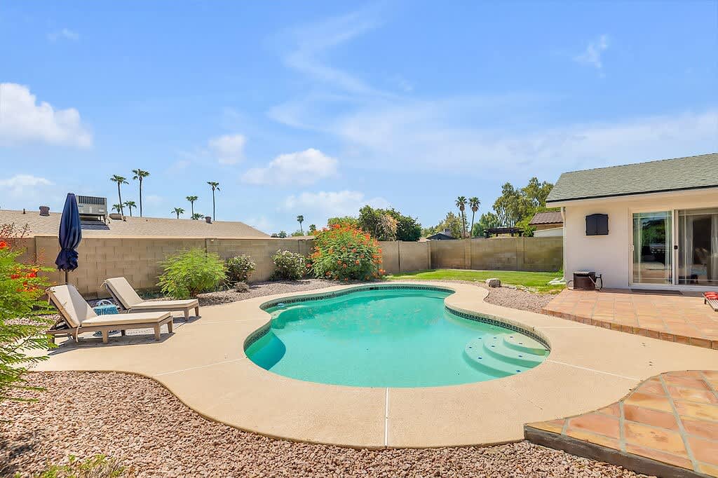 AZSC30-Casa Burke - Good Life Vacation Homes Welcome to your perfect getaway in beautiful Scottsdale, AZ- Casa Burke! This spacious single-story home comfortably sleeps 8 guests with four bedrooms and two full bathrooms. Whether you're here to relax or explore, this property offers everything you need for a memorable stay. Enjoy your favorite shows and movies with Smart TVs throughout the home: a 40-inch TV in the front room, a 65-inch TV in the family room, and a 42-inch TV on the back patio (use your own app logins). The kitchen is fully equipped with modern appliances, including a refrigerator with an ice dispenser, microwave, oven, blender, stove, Keurig coffee maker, dishwasher, and water dispenser. There's also a washer and dryer for your convenience! For indoor fun, challenge your friends and family to a game on the pool table, ping pong table, or foosball table. If you’re musically inclined, there’s even a piano! The home is equipped with central A/C, ceiling fans, portable fans or heaters, and essential safety features like a carbon monoxide detector, fire extinguisher, first aid kit, and smoke alarms. An ironing board is also available. Step outside to a private fenced-in backyard where you can relax on the patio, featuring a loveseat, two chairs with a table, a dining table with seating for six, and two lounge chairs. Enjoy a game of darts on our dartboard. The highlight of the outdoor space is the private swimming pool, perfect for cooling off under the Arizona sun. When you’re ready to explore Scottsdale, there’s no shortage of activities. Visit Old Town for shopping, dining, and a taste of the Old West, hike Camelback Mountain, or shop at Fashion Square Mall. Don't miss out on the Scottsdale Arts District, the Scottsdale Museum of Contemporary Art, Phoenix Botanical Gardens, and Butterfly World. Golf enthusiasts will find plenty of courses to choose from, and sports fans can catch MLB Spring Training, or a Cardinals NFL game, Diamondbacks MLB game, or Coyotes NHL game. ** BED CONFIGURATION ** Bedroom One: Queen Bed Bedroom Two: Two Twin Beds Bedroom Three: Queen Bed Bedroom Four: Queen Bed Common Spaces: Queen size pull out couch in living room, Twin size futon couch in front room area. All guests will be required to sign a rental agreement prior to receiving check in instructions. Due To A New City Ordinance: • All reservations will go through a verification process • Please be sure your full name is entered on your reservation when booking • IDs will be requested for verification after booking • We report and prosecute all credit card fraud