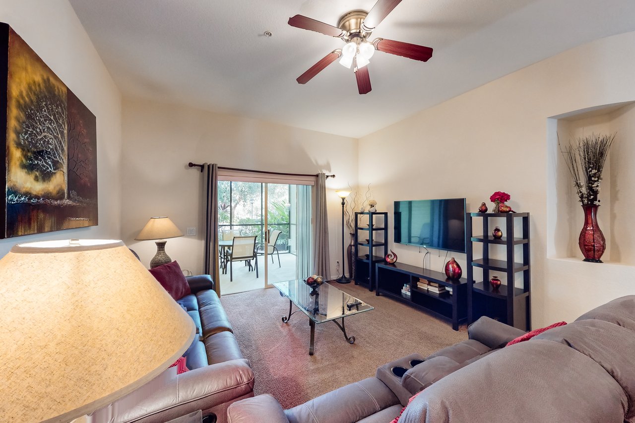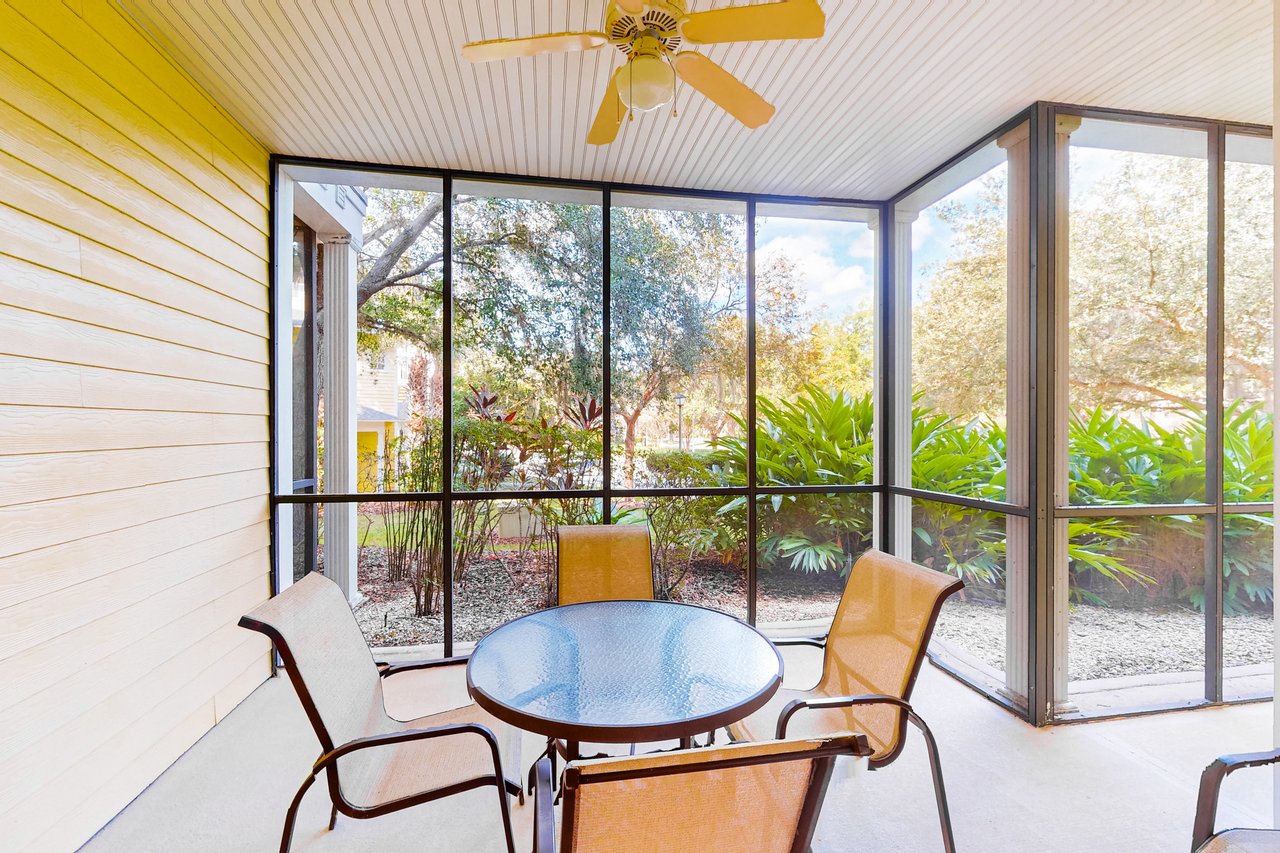 The Andros is our plus-sized 2-bedroom villa boasting nearly 1,400 square feet of livable space and amazing architectural details like vaulted ceilings throughout. The Andros includes a king-sized bed in the primary bedroom, and one twin bed and one queen bed in the guest bedroom. Available with laminate flooring or full carpet throughout, our Andros villa is perfect for vacationers who have children. The Andros has a crib, a highchair, and two full bathrooms - the primary bath has dual sinks, separate showers, and a tub. It also features a large and fully-equipped kitchen which has all major appliances and includes crockery, cookware, utensils, and glassware so you can stay in and have family meals in the dining area. Enjoy coffee, drinks and the views from one of your two screened balconies. The spacious living area features brand-new sofas, where you can settle comfortably and watch cable TV. An in-unit laundry room provides additional convenience. The Bahama Bay Resort & Spa boasts amenities like shared pools, hot tubs, fitness center, and a sauna. Located on the shores of Old Lake Davenport, you can enjoy the sand beach, view wildlife from the pier, or relax in a hammock. The resort is also conveniently located near Polo Park East Golf Course. Located only 10 miles from Walt Disney World, there are plenty of local dining and shopping options nearby. Disney Springs offers over 100 shops and 60 restaurants along with daily and nightly entertainment. Gatorland has a free-flight aviary, petting zoo, animal shows, zip line, and a new Stompin' Gator Off-Road Adventure. For additional entertainment, Sea World is just 16 miles away, Universal Studios is 22 miles and for the younger guests, Legoland Florida is 23 miles away from the resort. The Market Place, located in the main Clubhouse, offers a wide selection of items from sundries and necessities to souvenirs, apparel, gifts, drinks, snacks, ice cream, and accessories.
