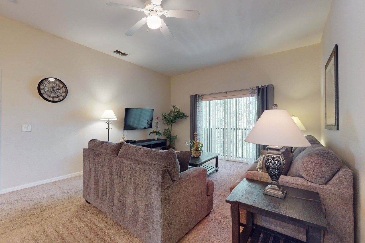 The most spacious of all our properties, the Gran Bahama villas offer more than 1,700 square feet of living area, perfect for larger families looking for accommodation near the Magic Kingdom. This villa boasts a king-sized bed in the primary bedroom, along with a queen-sized bed in the first guest bedroom and two twin beds in the second guest bedroom. Each unit includes a highchair and portable play yard, for families traveling with infants. The Gran Bahama villas also feature two full bathrooms - with the primary bath featuring dual sinks and a separate tub and shower. With a fully equipped kitchen and in-unit laundry room, the Gran Bahama Villa has all the conveniences of home combined with all the amenities of a resort. So whether you start your day off with a coffee on the screened-in balcony of your villa, a swim in one of Bahama Bay's four pools, or a walk around the beautifully maintained grounds, Bahama Bay is an ideal location for your next Orlando vacation. What's nearby: The Bahama Bay Resort & Spa boasts amenities like shared pools, hot tubs, fitness center, and a sauna. Located on the shores of Old Lake Davenport, you can enjoy the sand beach, view wildlife from the pier, or relax in a hammock. The resort is also conveniently located near Polo Park East Golf Course. Located only 10 miles from Walt Disney World, there are plenty of local dining and shopping options nearby. Disney Springs offers over 100 shops and 60 restaurants along with daily and nightly entertainment. Gatorland has a free-flight aviary, petting zoo, animal shows, zip line, and a new Stompin' Gator Off-Road Adventure. For additional entertainment, Sea World is just 16 miles away, Universal Studios is 22 miles and for the younger guests, Legoland Florida is 23 miles away from the resort. The Tradewinds Restaurant and Bar, located within the resort, is located poolside on the shore of Lake Davenport. With both indoor and outdoor seating, as well as a bar with lake views, guests can enjoy ice cold drinks, signature burgers and fries, and more! The Market Place, located in the main Clubhouse, offers a wide selection of items from sundries and necessities to souvenirs, apparel, gifts, drinks, snacks, ice cream, and accessories. Things to know: Free WiFi Full Kitchen Please note: All shared amenities are open and operating under limited capacity and new operating hours. Specific information will be provided after booking. Outdoor parking is available at no charge. Motorcycles are permitted but may not remain on a trailer. Trailers of any kind, RVs, and jet skis are not allowed. Commercial or logo-marked vehicles are also prohibited unless they are actively providing service or making a delivery.