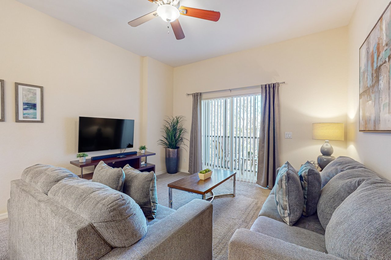 Boasting more than 1,200 square feet of space, the 3-bedroom Abacos villas at Bahama Bay Resort & Spa are ideal for family vacations or group getaways. Comfortable queen-sized beds are standard in the master bedroom and first guest bedroom, while the second guest bedroom features two twin beds. Additional sleeping space is available via a sleeper-sofa that opens up into a queen-sized bed in the living room. The Abacos villas feature two full bathrooms. Enjoy meals in the fully-equipped kitchen which includes all major appliances such as a refrigerator, oven, stove and microwave, and also includes cookware, utensils, and glassware. With plenty of room to spread out, guests will love the spacious living room-dining room area and can take in the scenery from a screened balcony with tables and chairs. An in-unit laundry room means guests can wash clothes while watching cable TV in the living room or master bedroom, or while keeping an eye on the little ones in the crib and highchair included in each unit. The Bahama Bay Resort & Spa boasts amenities like shared pools, hot tubs, fitness center, and a sauna. Located on the shores of Old Lake Davenport, you can enjoy the sand beach, view wildlife from the pier, or relax in a hammock. The resort is also conveniently located near Polo Park East Golf Course. Located only 10 miles from Walt Disney World, there are plenty of local dining and shopping options nearby. Disney Springs offers over 100 shops and 60 restaurants along with daily and nightly entertainment. Gatorland has a free-flight aviary, petting zoo, animal shows, zip line, and a new Stompin' Gator Off-Road Adventure. For additional entertainment, Sea World is just 16 miles away, Universal Studios is 22 miles and for the younger guests, Legoland Florida is 23 miles away from the resort. The Tradewinds Restaurant and Bar, located within the resort, is located poolside on the shore of Lake Davenport. With both indoor and outdoor seating, as well as a bar with lake views, guests can enjoy ice cold drinks, signature burgers and fries, and more! The Market Place, located in the main Clubhouse, offers a wide selection of items from sundries and necessities to souvenirs, apparel, gifts, drinks, snacks, ice cream, and accessories. THINGS TO KNOW Guests must be 25 years of age or older to check in or stay. If you are under 25 years old and are not accompanied by a parent or legal guardian that is 25 years of age or older, you will not be permitted to stay in this unit. Please call Vacasa as soon as possible about your reservation. Please note: Outdoor parking is available at no charge. Motorcycles are permitted but may not remain on a trailer. Trailers of any kind, RVs, and jet skis are not allowed. Commercial or logo-marked vehicles are also prohibited unless they are actively providing service or making a delivery.