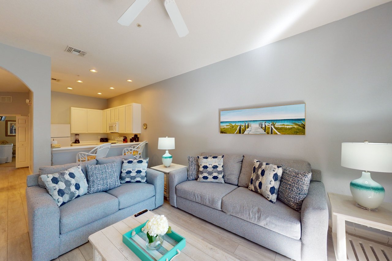 Boasting more than 1,200 square feet of space, the Abacos condos at Bahama Bay Resort & Spa are ideal for family vacations or group getaways. Enjoy meals in the well-equipped kitchen, which includes all major appliances, cookware, utensils, and glassware. With plenty of room to spread out, guests will love the spacious living room-dining room area and can take in the scenery from a screened balcony with tables and chairs. An in-condo laundry room means guests can wash clothes while watching cable TV in the living area or main bedroom or while keeping an eye on the little ones in the high chair. The Bahama Bay Resort & Spa boasts amenities like shared pools, hot tubs, a fitness center, and a sauna. Located on the shores of Old Lake Davenport, you can enjoy the sand beach, view wildlife from the pier, or relax in a hammock. An electric vehicle charger is available for guest use. The resort is also conveniently located near Polo Park East Golf Course. Located only ten miles from Walt Disney World, plenty of local dining and shopping options are nearby. Disney Springs offers more than 100 shops and 60 restaurants along with daily and nightly entertainment. Gatorland has a free-flight aviary, petting zoo, animal shows, zip line, and a new Stompin' Gator Off-Road Adventure. For additional entertainment, Sea World is just 16 miles away, Universal Studios is 22 miles, and for the younger guests, Legoland Florida is 23 miles away from the resort. The Tradewinds Restaurant and Bar, located within the resort, is poolside on Lake Davenport's shore. With indoor and outdoor seating and a bar with lake views, guests can enjoy ice-cold drinks and signature burgers and fries! The Market Place, located in the main Clubhouse, offers a wide selection of items from sundries and necessities to souvenirs, apparel, gifts, drinks, snacks, ice cream, and accessories. RESORT AMENITIES -Pool -Hot tub -Sauna -Tennis court -Basketball court -Fitness room THINGS TO KNOW Please note: All shared amenities are open and operating under limited capacity and new operating hours. Specific information will be provided after booking. Outdoor parking is available at no charge. Motorcycles are permitted but may not remain on a trailer. Trailers of any kind, RVs, and jet skis are not allowed. Commercial or logo-marked vehicles are also prohibited unless they are actively providing service or making a delivery.
