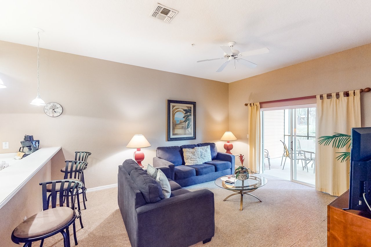 The Andros is our plus-sized 2-bedroom villa boasting nearly 1,400 square feet of livable space and amazing architectural details like vaulted ceilings throughout. The Andros includes a king-sized bed in the master bedroom, two twin beds in the guest bedroom and a sofa in the living room that opens into a queen-sized bed. Available with laminate flooring or full carpet throughout, our Andros villa is perfect for vacationers who have children. The Andros has a crib, a highchair, and two full bathrooms - the master bath has dual sinks, separate showers, and a tub. It also features a large and fully-equipped kitchen which has all major appliances and includes crockery, cookware, utensils, and glassware so you can stay in and have family meals in the dining area. Enjoy coffee, drinks and the views from one of your two screened balconies. Or, stretch out in the spacious living area and enjoy cable TV while washing clothes in the in-unit laundry room. What's nearby: The Bahama Bay Resort & Spa boasts amenities like shared pools, hot tubs, fitness center, and a sauna. Located on the shores of Old Lake Davenport, you can enjoy the sand beach, view wildlife from the pier, or relax in a hammock. The resort is also conveniently located near Polo Park East Golf Course. Located only 10 miles from Walt Disney World, there are plenty of local dining and shopping options nearby. Disney Springs offers over 100 shops and 60 restaurants along with daily and nightly entertainment. Gatorland has a free-flight aviary, petting zoo, animal shows, zip line, and a new Stompin' Gator Off-Road Adventure. For additional entertainment, Sea World is just 16 miles away, Universal Studios is 22 miles and for the younger guests, Legoland Florida is 23 miles away from the resort. The Tradewinds Restaurant and Bar, located within the resort, is located poolside on the shore of Lake Davenport. With both indoor and outdoor seating, as well as a bar with lake views, guests can enjoy ice cold drinks, signature burgers and fries, and more! The Market Place, located in the main Clubhouse, offers a wide selection of items from sundries and necessities to souvenirs, apparel, gifts, drinks, snacks, ice cream, and accessories. Things to know: Free WiFi Full Kitchen Please note: All shared amenities are open and operating under limited capacity and new operating hours. Specific information will be provided after booking. Outdoor parking is available at no charge. Motorcycles are permitted but may not remain on a trailer. Trailers of any kind, RVs, and jet skis are not allowed. Commercial or logo-marked vehicles are also prohibited unless they are actively providing service or making a delivery.