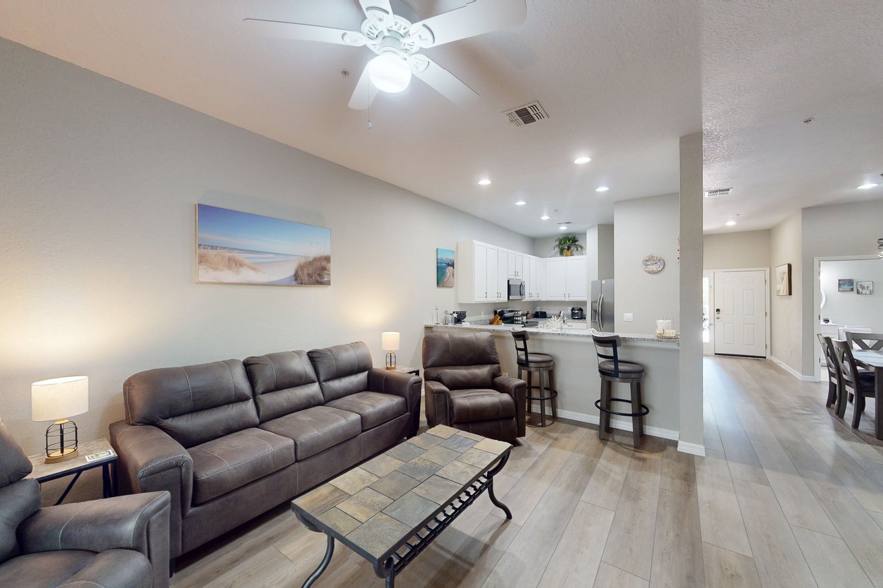 Newly Renovated 1st floor condo w/ sauna, pools, near theme parks, basketball/tennis court! The Andros is our plus-sized 2-bedroom villa boasting nearly 1,400 square feet of livable space and amazing architectural details like vaulted ceilings throughout. The Andros includes a king-sized bed in the master bedroom, a king-sized bed in the guest bedroom and a sofa bed in the living room that opens into a queen-sized bed. Perfect for vacationers who have children, this villa has a crib and a highchair, and has two full bathrooms - the master bath has dual sinks, separate showers and a tub. The Andros features a large and fully-equipped kitchen which has all major appliances and also includes crockery, cookware, utensils and glassware so you can stay in and have family meals in the dining area. Enjoy coffee, drinks and the views from one of your two screened balconies. Or, stretch out in the spacious living area and enjoy cable TV while washing clothes in the in-unit laundry room. What's nearby: The Bahama Bay Resort & Spa boasts amenities like shared pools, hot tubs, fitness center, and a sauna. Located on the shores of Old Lake Davenport, you can enjoy the sand beach, view wildlife from the pier, or relax in a hammock. The resort is also conveniently located near Polo Park East Golf Course. Located only 10 miles from Walt Disney World, there are plenty of local dining and shopping options nearby. Disney Springs offers over 100 shops and 60 restaurants along with daily and nightly entertainment. Gatorland has a free-flight aviary, petting zoo, animal shows, zip line, and a new Stompin' Gator Off-Road Adventure. For additional entertainment, Sea World is just 16 miles away, Universal Studios is 22 miles and for the younger guests, Legoland Florida is 23 miles away from the resort. The Tradewinds Restaurant and Bar, located within the resort, is located poolside on the shore of Lake Davenport. With both indoor and outdoor seating, as well as a bar with lake views, guests can enjoy ice cold drinks, signature burgers and fries, and more! The Market Place, located in the main Clubhouse, offers a wide selection of items from sundries and necessities to souvenirs, apparel, gifts, drinks, snacks, ice cream, and accessories. Things to know: Free WiFi Full Kitchen Please note: All shared amenities are open and operating under limited capacity and new operating hours. Specific information will be provided after booking. Outdoor parking is available at no charge. Motorcycles are permitted but may not remain on a trailer. Trailers of any kind, RVs, and jet skis are not allowed. Commercial or logo-marked vehicles are also prohibited unless they are actively providing service or making a delivery.
