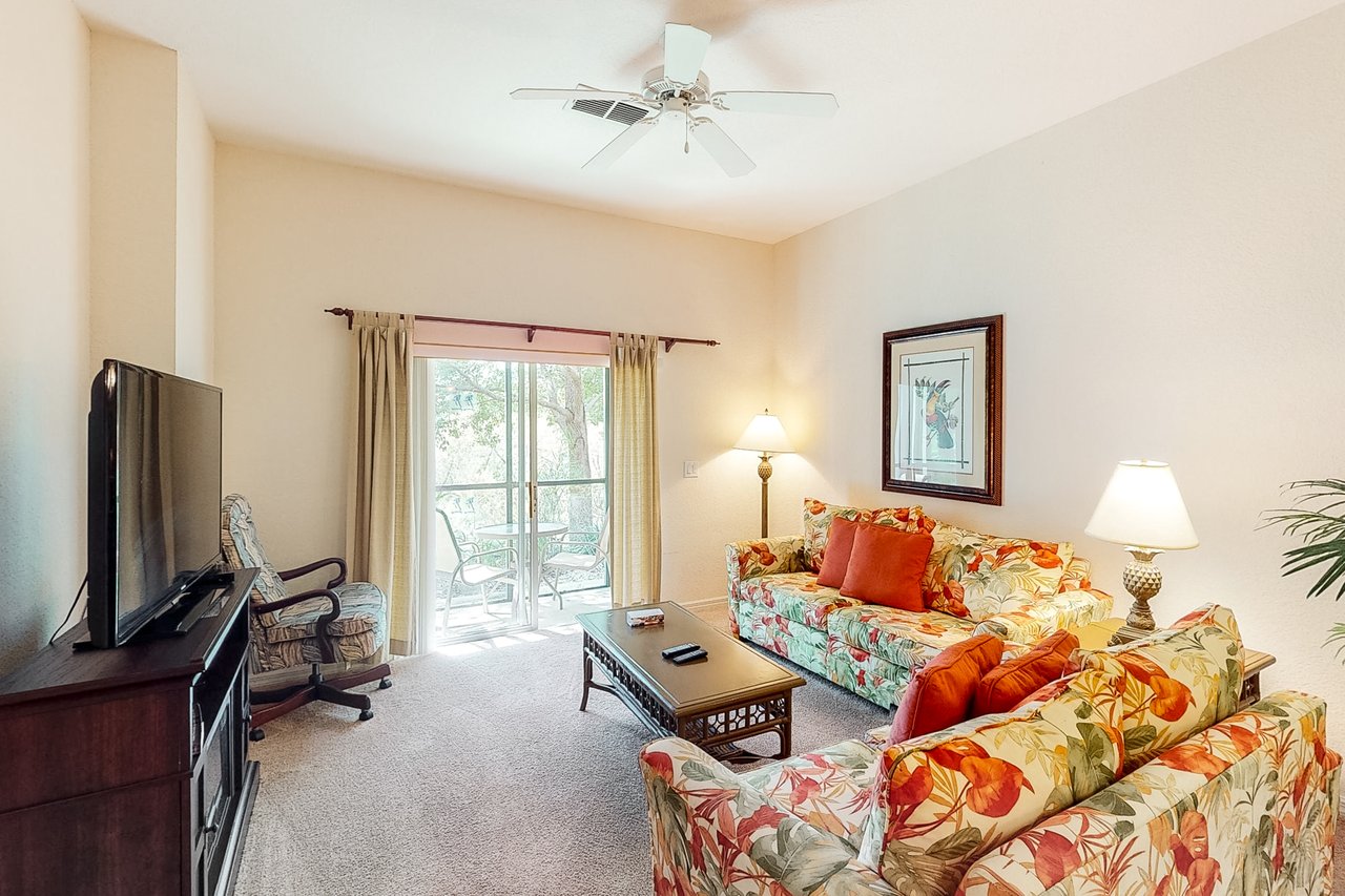 Boasting more than 1,200 square feet of space, the 3-bedroom Abacos villas at Bahama Bay Resort & Spa are ideal for family vacations or group getaways. Comfortable queen-sized beds are standard in the master bedroom and first guest bedroom, while the second guest bedroom features two twin beds. Additional sleeping space is available via a sleeper-sofa that opens up into a queen-sized bed in the living room. The Abacos villas feature two full bathrooms. Enjoy meals in the fully-equipped kitchen which includes all major appliances such as a refrigerator, oven, stove and microwave, and also includes cookware, utensils, and glassware. With plenty of room to spread out, guests will love the spacious living room-dining room area and can take in the scenery from a screened balcony with tables and chairs. An in-unit laundry room means guests can wash clothes while watching cable TV in the living room or master bedroom, or while keeping an eye on the little ones in the crib and highchair included in each unit. What's nearby: The Bahama Bay Resort & Spa boasts amenities like shared pools, hot tubs, fitness center, and a sauna. Located on the shores of Old Lake Davenport, you can enjoy the sand beach, view wildlife from the pier, or relax in a hammock. The resort is also conveniently located near Polo Park East Golf Course. Located only 10 miles from Walt Disney World, there are plenty of local dining and shopping options nearby. Disney Springs offers over 100 shops and 60 restaurants along with daily and nightly entertainment. Gatorland has a free-flight aviary, petting zoo, animal shows, zip line, and a new Stompin' Gator Off-Road Adventure. For additional entertainment, Sea World is just 16 miles away, Universal Studios is 22 miles and for the younger guests, Legoland Florida is 23 miles away from the resort. The Tradewinds Restaurant and Bar, located within the resort, is located poolside on the shore of Lake Davenport. With both indoor and outdoor seating, as well as a bar with lake views, guests can enjoy ice cold drinks, signature burgers and fries, and more! The Market Place, located in the main Clubhouse, offers a wide selection of items from sundries and necessities to souvenirs, apparel, gifts, drinks, snacks, ice cream, and accessories. Things to know: Free WiFi Full Kitchen Please note: All shared amenities are open and operating under limited capacity and new operating hours. Specific information will be provided after booking. Outdoor parking is available at no charge. Motorcycles are permitted but may not remain on a trailer. Trailers of any kind, RVs, and jet skis are not allowed. Commercial or logo-marked vehicles are also prohibited unless they are actively providing service or making a delivery.