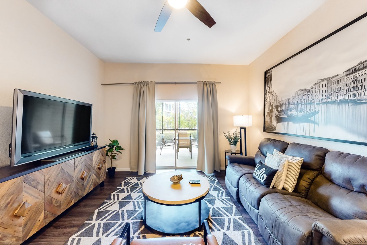 The Andros is our plus-sized 2-bedroom villa boasting nearly 1,400 square feet of livable space and amazing architectural details like vaulted ceilings throughout. The Andros includes a king-sized bed in the master bedroom, two twin beds in the guest bedroom and a sofa in the living room that opens into a queen-sized bed. Available with laminate flooring or full carpet throughout, our Andros villa is perfect for vacationers who have children. The Andros has a crib, a highchair, and two full bathrooms - the master bath has dual sinks, separate showers, and a tub. It also features a large and fully-equipped kitchen which has all major appliances and includes crockery, cookware, utensils, and glassware so you can stay in and have family meals in the dining area. Enjoy coffee, drinks and the views from one of your two screened balconies. Or, stretch out in the spacious living area and enjoy cable TV while washing clothes in the in-unit laundry room. What's nearby: The Bahama Bay Resort & Spa boasts amenities like shared pools, hot tubs, fitness center, and a sauna. Located on the shores of Old Lake Davenport, you can enjoy the sand beach, view wildlife from the pier, or relax in a hammock. The resort is also conveniently located near Polo Park East Golf Course. Located only 10 miles from Walt Disney World, there are plenty of local dining and shopping options nearby. Disney Springs offers over 100 shops and 60 restaurants along with daily and nightly entertainment. Gatorland has a free-flight aviary, petting zoo, animal shows, zip line, and a new Stompin' Gator Off-Road Adventure. For additional entertainment, Sea World is just 16 miles away, Universal Studios is 22 miles and for the younger guests, Legoland Florida is 23 miles away from the resort. The Tradewinds Restaurant and Bar, located within the resort, is located poolside on the shore of Lake Davenport. With both indoor and outdoor seating, as well as a bar with lake views, guests can enjoy ice cold drinks, signature burgers and fries, and more! The Market Place, located in the main Clubhouse, offers a wide selection of items from sundries and necessities to souvenirs, apparel, gifts, drinks, snacks, ice cream, and accessories. Things to know: Free WiFi Full Kitchen Please note: All shared amenities are open and operating under limited capacity and new operating hours. Specific information will be provided after booking. Outdoor parking is available at no charge. Motorcycles are permitted but may not remain on a trailer. Trailers of any kind, RVs, and jet skis are not allowed. Commercial or logo-marked vehicles are also prohibited unless they are actively providing service or making a delivery.