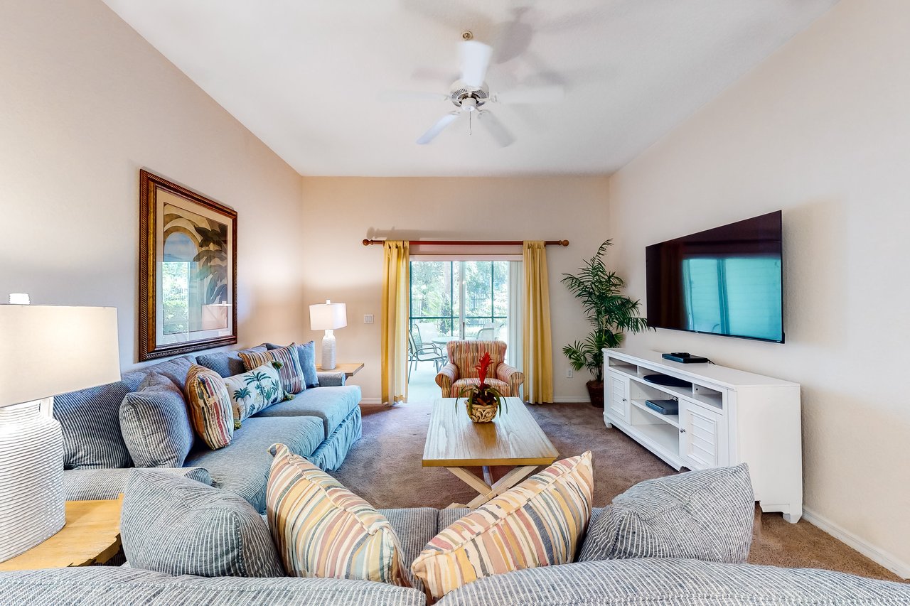 The Andros is our plus-sized 2-bedroom villa boasting nearly 1,400 square feet of livable space and amazing architectural details like vaulted ceilings throughout. The Andros includes a king-sized bed in the master bedroom, two twin beds in the guest bedroom and a sofa in the living room that opens into a queen-sized bed. Available with laminate flooring or full carpet throughout, our Andros villa is perfect for vacationers who have children. The Andros has a crib, a highchair, and two full bathrooms - the master bath has dual sinks, separate showers, and a tub. It also features a large and fully-equipped kitchen which has all major appliances and includes crockery, cookware, utensils, and glassware so you can stay in and have family meals in the dining area. Enjoy coffee, drinks and the views from one of your two screened balconies. Or, stretch out in the spacious living area and enjoy cable TV while washing clothes in the in-unit laundry room. What's nearby: The Bahama Bay Resort & Spa boasts amenities like shared pools, hot tubs, fitness center, and a sauna. Located on the shores of Old Lake Davenport, you can enjoy the sand beach, view wildlife from the pier, or relax in a hammock. The resort is also conveniently located near Polo Park East Golf Course. Located only 10 miles from Walt Disney World, there are plenty of local dining and shopping options nearby. Disney Springs offers over 100 shops and 60 restaurants along with daily and nightly entertainment. Gatorland has a free-flight aviary, petting zoo, animal shows, zip line, and a new Stompin' Gator Off-Road Adventure. For additional entertainment, Sea World is just 16 miles away, Universal Studios is 22 miles and for the younger guests, Legoland Florida is 23 miles away from the resort. The Tradewinds Restaurant and Bar, located within the resort, is located poolside on the shore of Lake Davenport. With both indoor and outdoor seating, as well as a bar with lake views, guests can enjoy ice cold drinks, signature burgers and fries, and more! The Market Place, located in the main Clubhouse, offers a wide selection of items from sundries and necessities to souvenirs, apparel, gifts, drinks, snacks, ice cream, and accessories. Things to know: Free WiFi Full Kitchen Please note: All shared amenities are open and operating under limited capacity and new operating hours. Specific information will be provided after booking.