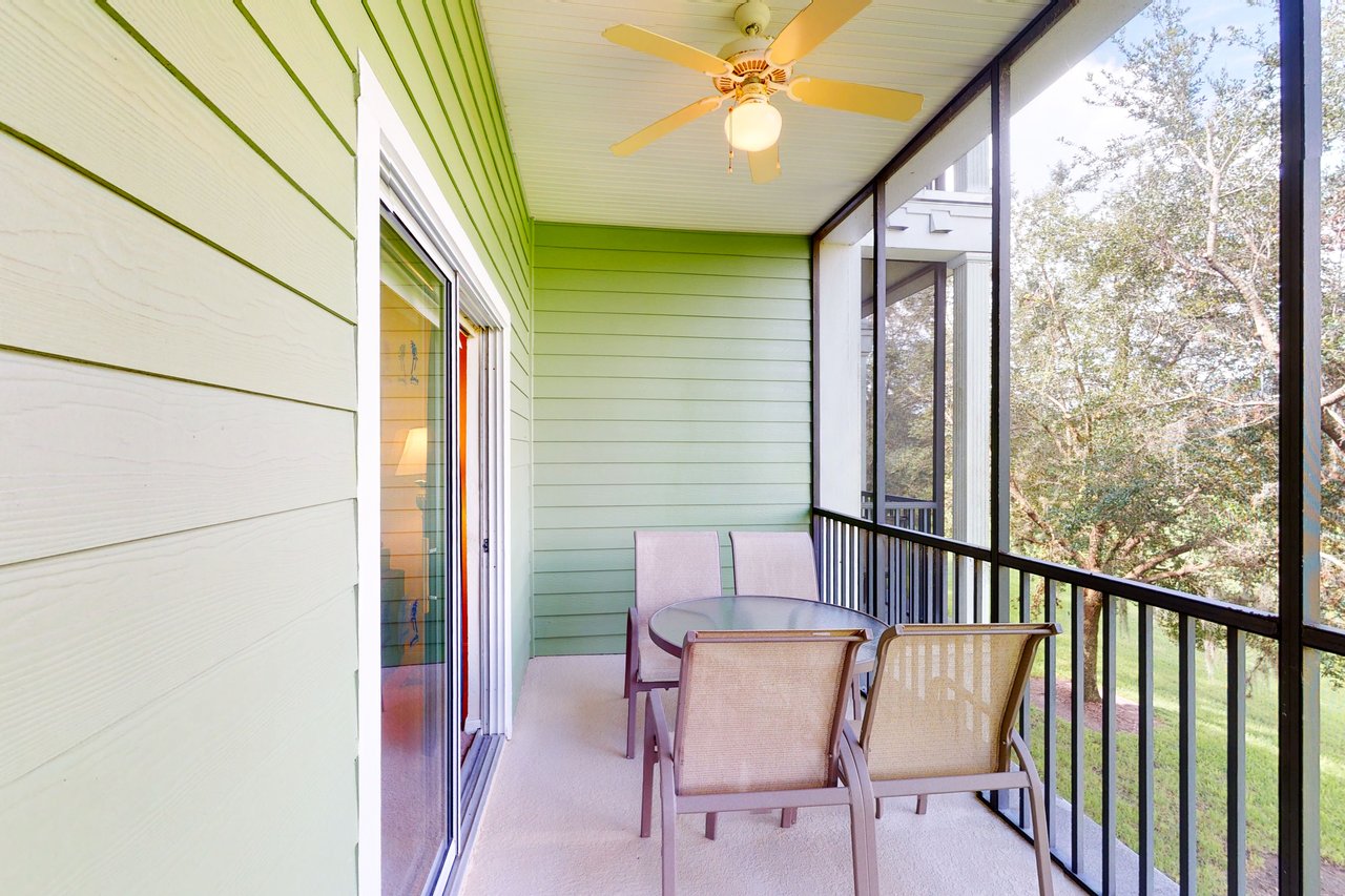 Blending comfort and value, the 2-bedroom San Salvador provides 1,116 square feet of space and enticing extras such as an in-unit laundry room, a private screened balcony and vaulted ceilings. The San Salvador includes a queen-sized bed in the master bedroom, two twin beds in the guest bedroom, and a sofa in the living room that opens into a queen-sized bed. Perfect for vacationers who have children, this villa includes a crib and a highchair, and has two full bathrooms. The San Salvador's large and fully-equipped kitchen has all the major appliances and also includes crockery, cookware, utensils and glassware so you can stay in and have family meals in the dining area. Two large televisions with included cable channels mean different groups can stretch out in the spacious living area and in the master bedroom to enjoy different programming at the same time.