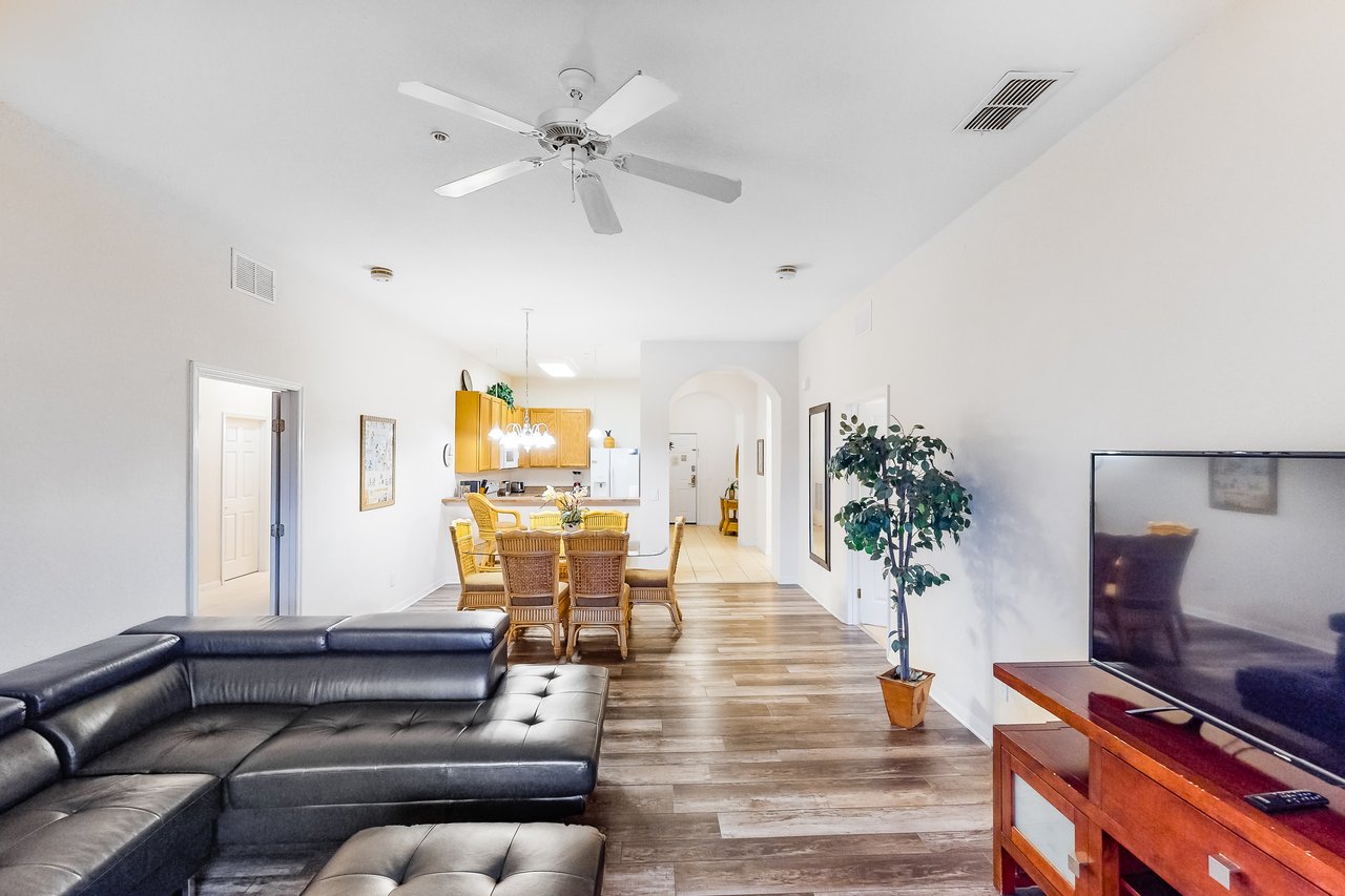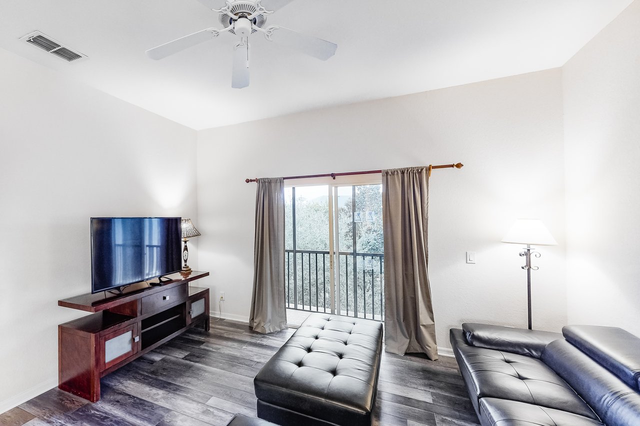 Welcome to a truly family-friendly condo, all set up for your comfortable stay in Bahama Bay. Make up a cup of coffee in the full kitchen to relax from your flight, then enjoy it on your own furnished screened-in patio (accessible from both the living room and the two main bedrooms). The kitchen is fully equipped for cooking up favorite foods, plus a couple of fun appliances like a rice cooker and ice cream maker for late-night cooking experiments. Central air conditioning will keep everyone comfortable, enhanced by the tile and wood-style flooring set up throughout the condo. But don't worry - the bedrooms are carpeted so no one has cold toes when getting up in the morning. When everyone's tired from exploring the parks, you can kick back on the sectional sofa on the living room and play some favorite tunes on the stereo. There's a TV in each bedroom, so it won't be a problem if someone small needs to wind down to Frozen. Look for the Disney touches in the bedrooms! Bahama Bay features many shared amenities for guests to explore, including a clubhouse and the Tradewinds restaurant. Four heated pools are sprinkled throughout the resort, and there's a fun splashpad for the kids to enjoy when they're ready for a pool break. Enjoy the use of a volleyball court and basketball court for getting out post-driving wiggles. There's also a fitness center if you want to stick to your workout routine. If luxurious unwinding is more your speed, Cenote Day Spa offers services within the Clubhouse. When you're ready to head to the parks, Disney World, Disney's Animal Kingdom, and Epcot are all within 12 miles. Universal Studios and the Wizarding World of Harry Potter are both under 23 miles from the condo. The Showcase of Citrus offers local farm fun (and fresh fruit!) just eight-and-a-half miles away. THINGS TO KNOW Snowbird-friendly. Gated entrance and 24-hour front desk. Beach towels are available for guest use. A car is necessary to best enjoy this home. Guests can enjoy fishing at Lake Davenport, but they will need a fishing license. An electric vehicle charger in the clubhouse parking lot is available for guest use. This is a third-floor unit. There is not an elevator on the property. Please note: All shared amenities are open and operating under limited capacity and new operating hours. Specific information will be provided after booking. Outdoor parking is available at no charge. Motorcycles are permitted but may not remain on a trailer. Trailers of any kind, RVs, and jet skis are not allowed. Commercial or logo-marked vehicles are also prohibited unless they are actively providing service or making a delivery.