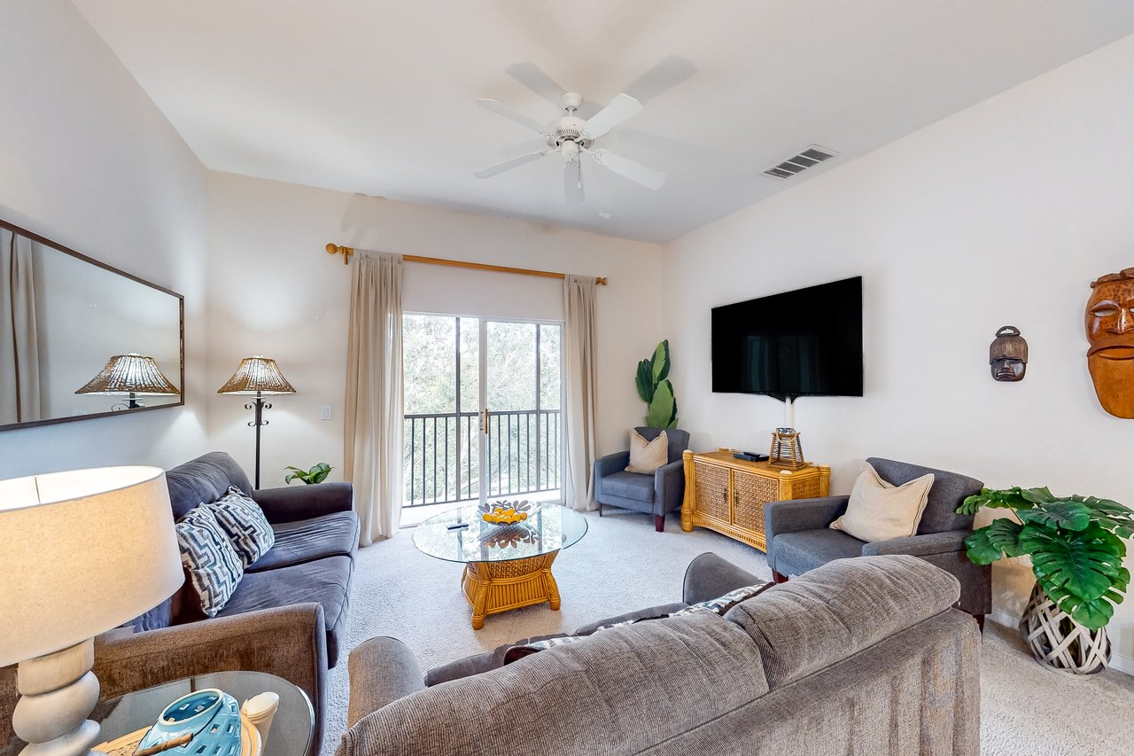 The most spacious of all our properties, the Gran Bahama villas offer more than 1,700 square feet of living area, perfect for larger families looking for accommodation near the Magic Kingdom. This villa boasts a king-sized bed in the master bedroom, along with a queen-sized bed in the first guest bedroom and two twin beds in the second guest bedroom. There is also a queen-sized sofabed in the living area. Each unit includes a highchair and portable play yard, for families travelling with infants. The Gran Bahama villas also feature two full bathrooms - with the master bath featuring dual sinks and a separate tub and shower. With a fully equipped kitchen, and in-unit laundry room, the Gran Bahama Villa has all the conveniences of home combined with all the amenities of a resort. So whether you start your day off with a coffee on the screened-in balcony of your villa, a swim in one of Bahama Bay's four pools, or a walk around the beautifully maintained grounds...Bahama Bay is an ideal location for your next Orlando vacation. What's nearby: The Bahama Bay Resort & Spa boasts amenities like shared pools, hot tubs, fitness center, and a sauna. Located on the shores of Old Lake Davenport, you can enjoy the sand beach, view wildlife from the pier, or relax in a hammock. The resort is also conveniently located near Polo Park East Golf Course. Located only 10 miles from Walt Disney World, there are plenty of local dining and shopping options nearby. Disney Springs offers over 100 shops and 60 restaurants along with daily and nightly entertainment. Gatorland has a free-flight aviary, petting zoo, animal shows, zip line, and a new Stompin' Gator Off-Road Adventure. For additional entertainment, Sea World is just 16 miles away, Universal Studios is 22 miles and for the younger guests, Legoland Florida is 23 miles away from the resort. The Tradewinds Restaurant and Bar, located within the resort, is located poolside on the shore of Lake Davenport. With both indoor and outdoor seating, as well as a bar with lake views, guests can enjoy ice cold drinks, signature burgers and fries, and more! The Market Place, located in the main Clubhouse, offers a wide selection of items from sundries and necessities to souvenirs, apparel, gifts, drinks, snacks, ice cream, and accessories. Things to know: Free WiFi Full Kitchen Please note: All shared amenities are open and operating under limited capacity and new operating hours. Specific information will be provided after booking. Outdoor parking is available at no charge. Motorcycles are permitted but may not remain on a trailer. Trailers of any kind, RVs, and jet skis are not allowed. Commercial or logo-marked vehicles are also prohibited unless they are actively providing service or making a delivery.