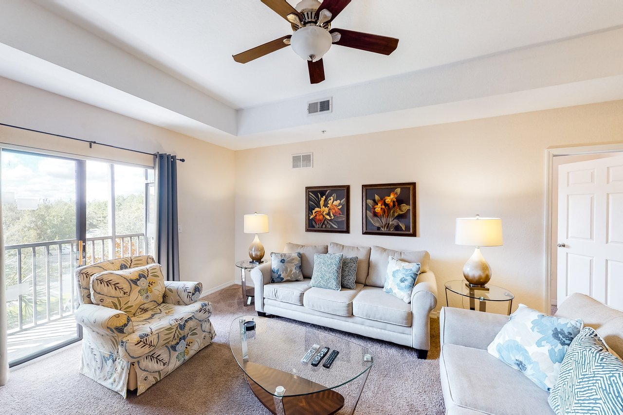Boasting a sprawling 1,600 square feet of comfort and style, the Curacao villa is a 3-bedroom unit that can sleep 8 guests comfortably. Architectural awe like vaulted ceilings and conveniences like three TVs with cable service and high-speed internet access make these villas both visually appealing and family-friendly. The Curacao has a king-sized bed in the master bedroom along with a queen-sized bed in the first guest bedroom and two twin beds in the second guest bedroom. To complement these luxurious rooms, the vast living area includes a sofa that converts into a queen-sized bed. The Curacao villas also have two full bathrooms to speed up prep time in the mornings- with the master bath featuring dual sinks and a separate tub and shower. Enjoy meals in the fully-equipped kitchen, which includes all major appliances such as a refrigerator, oven, stove and microwave, and also includes cookware, utensils and glassware. Enjoy coffee or drinks while taking in the scenery from one of two screened balconies with tables and chairs. An in-unit laundry room means guests can wash clothes while keeping an eye on the little ones in the crib and highchair included in each unit. What's nearby: Caribe Cove Condominiums boasts amenities like a shared pool, hot tub, fitness center, and a sauna. Day trips await within 20 miles or less at world-class theme parks, shopping centers, and golf courses. Whether you're here to explore the wonders of Walt Disney World, located less than eight miles from this rental, or simply relax, this Kissimmee home guarantees a good time for all! Things to know: Free WiFi Full Kitchen