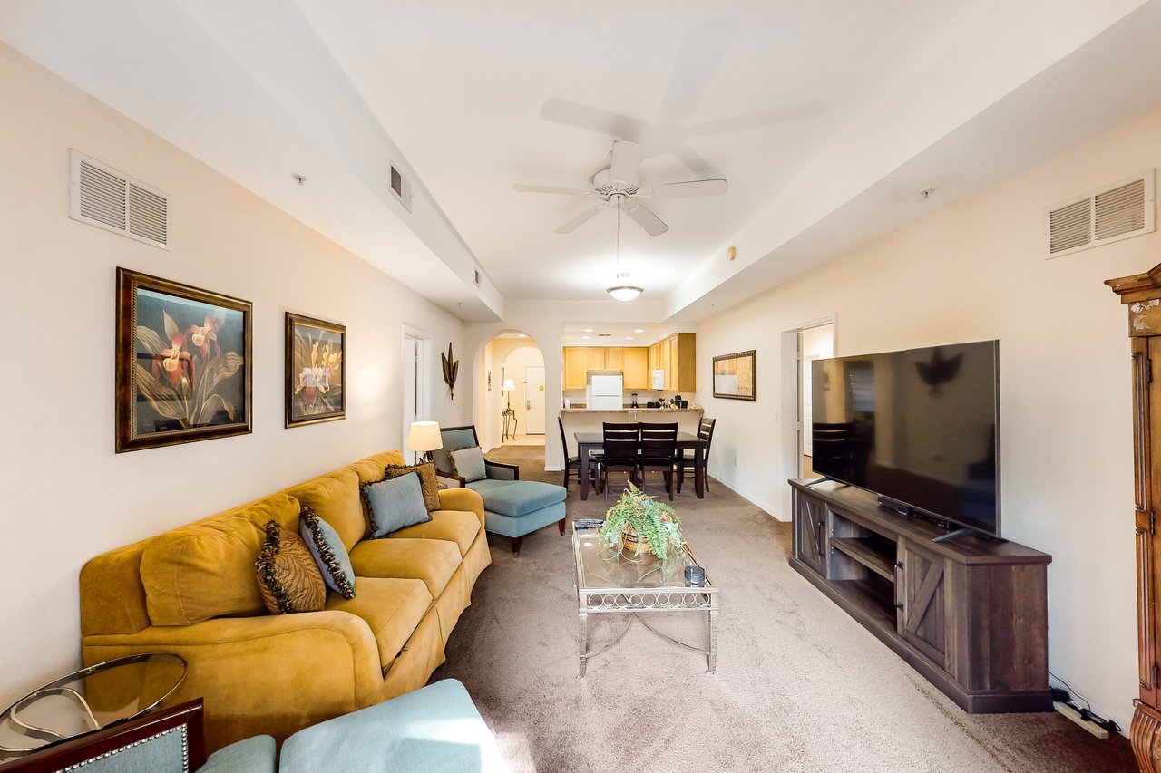 Boasting a sprawling 1,600 square feet of comfort and style, the Curacao villa offers a stunning vacation pad for your next Florida trip! Architectural awe like vaulted ceilings and conveniences like three TVs with cable service and high-speed internet access make these villas both visually appealing and family-friendly. To complement the luxurious bedrooms, the vast living area includes a sofa that converts into a queen-sized bed, when additional sleeping arrangements are needed. The Curacao villas also have two full bathrooms to speed up prep time in the mornings- with the primary bath featuring dual sinks and a separate tub and shower. Enjoy meals in the fully-equipped kitchen, which includes all major appliances such as a refrigerator, oven, stove, microwave, cookware, utensils, and glassware. Sip on your favorite beverages while taking in the scenery from one of two screened-in, furnished balconies. The in-unit laundry keeps chore time at bay. Caribe Cove Condominiums boasts amenities like a shared pool, hot tub, fitness center, and a sauna. Day trips await within 20 miles or less at world-class theme parks, shopping centers, and golf courses. Whether you're here to explore the wonders of Walt Disney World, located less than eight miles from this rental, or simply relax, this Kissimmee home guarantees a good time for all! Things to Know Check-in time: 4:00 p.m. Check-out time: 10:00 a.m. All guests shall abide by Vacasa’s good neighbor policy and shall not engage in illegal activity. Quiet hours are from 10:00 p.m. to 8:00 a.m. No smoking is permitted anywhere on the premises. (
