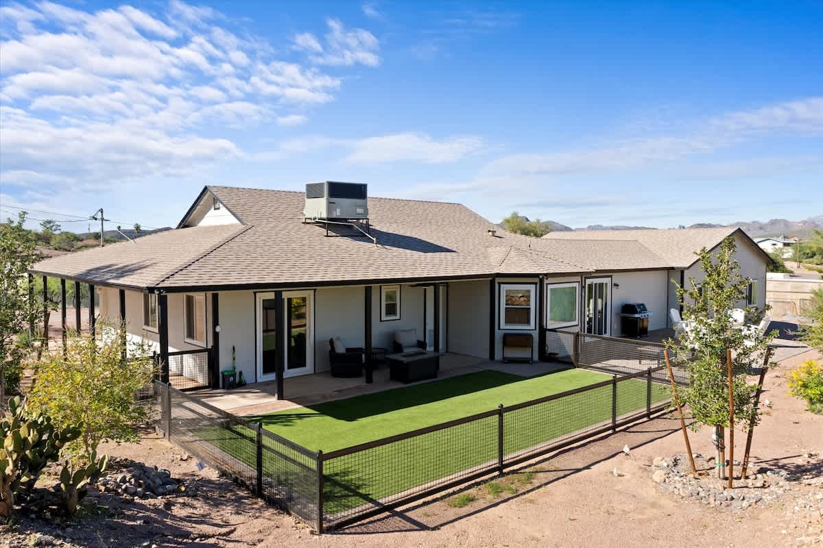 Welcome to Luna Mesa, a peaceful desert escape at 1574 E Dorothy St in Queen Valley, Arizona. This modern three-bedroom, two-bath retreat offers a perfect balance of comfort, design, and tranquility surrounded by sweeping mountain views and endless desert skies. Ideal for couples, families, or friends, Luna Mesa invites you to unwind, recharge, and experience the beauty of the Arizona desert. Inside, you’ll find a bright open-concept living area filled with natural light and elegant, modern décor. Relax on the comfortable seating, stream your favorite shows, or play games on the PS4. The fully equipped kitchen features modern appliances, quartz countertops, and all the essentials for preparing meals. The dining space flows seamlessly into the living area, creating an inviting atmosphere for gathering and conversation. The home includes three beautifully designed bedrooms and two full bathrooms. The primary suite features soft linens, a bidet, and direct access to the backyard for quiet mornings or starlit nights. Every room is thoughtfully arranged to create a sense of calm and relaxation, blending desert-inspired touches with clean, modern design. Step outside to your private backyard oasis, where you can enjoy coffee at sunrise or stargaze at night with the telescope provided for guests. The fully fenced yard makes this home perfect for pets, while the open desert air invites relaxation and connection. Whether you’re grilling dinner, sharing stories around the fire pit, or simply taking in the stillness of the evening, the outdoor space is designed for comfort and peace. Located in quiet Queen Valley, Luna Mesa offers easy access to local attractions and outdoor adventures. You’re just minutes from hiking trails, golf, and the rugged landscapes of the Superstition Mountains and Tonto National Forest. It’s the perfect home base for exploring nearby towns, scenic drives, or simply soaking in the desert’s natural beauty. Guests enjoy high-speed Wi-Fi, air conditioning, heating, a washer and dryer, self-check-in, and a fully stocked kitchen. Linens, towels, and toiletries are provided for your convenience. With its combination of privacy, modern comfort, and thoughtful amenities, Luna Mesa offers everything you need for a memorable desert getaway. Please note that the home is located in a peaceful residential neighborhood. We ask that guests respect quiet hours after dark. The area’s remote charm means you’ll want to pick up groceries or essentials before arriving. Luna Mesa is more than just a place to stay—it’s an experience of quiet beauty, modern comfort, and wide-open Arizona skies. House Rules and Notes: - No parties or events of any kind allowed on property - Must be 25+ years old to rent; the renting guest must stay in the home - No smoking - Check-in time is 4 PM - Check-out time is 10 AM - Early check-in/late check-out may be available for a fee - Pets allowed with prior approval (pet fee applies) City Ordinance Notice: - All reservations are subject to identity verification - Please enter your full legal name when booking - Valid ID will be required after booking - We report and prosecute all credit card fraud TPT #21594247