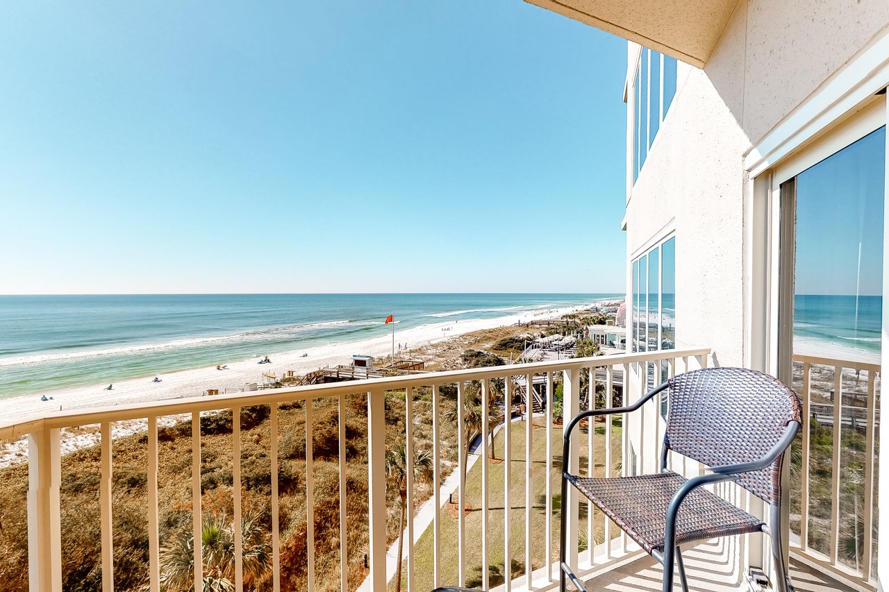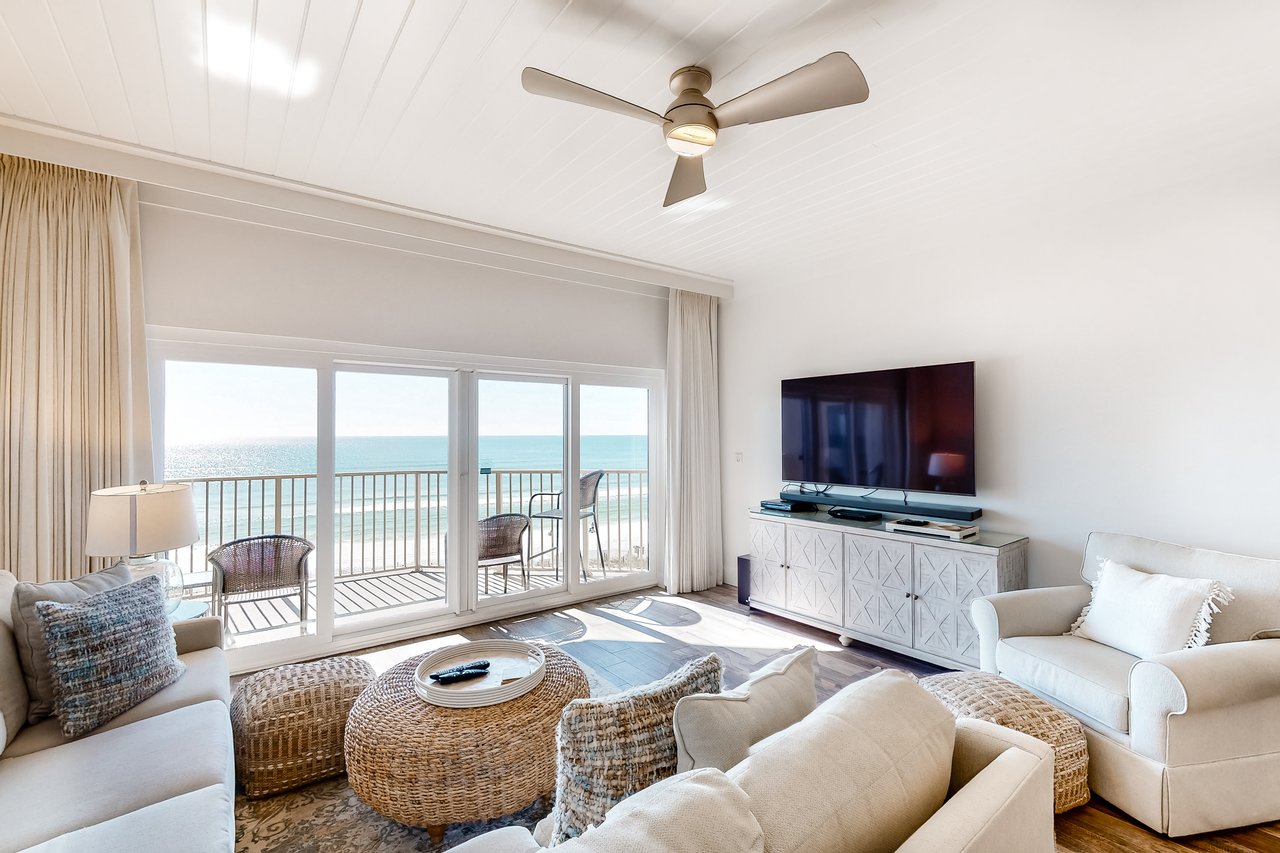 TOPS'L Beach Manor 510 by The Tops'l Lodging Company is a bright 2-bedroom, 2-bath oceanfront condominium offering spectacular Gulf views and an effortless beachfront escape in Miramar Beach. With an open-concept layout and a private balcony overlooking the shoreline, this inviting retreat is perfect for couples, friends, or families looking to relax into the rhythm of the coast. Start your mornings with coffee and ocean breezes, then spend your days enjoying everything TOPS’L has to offer. Inside, the condo feels light, comfortable, and welcoming, ideal for unwinding after time in the sun. The open living space makes it easy to gather together, whether you’re streaming your favorite music, planning the day ahead, or simply settling in for a quiet evening with the sound of the waves in the background. Enjoy access to TOPS’L’s resort-style amenities, including a Gulf-side swimming pool, a hot tub, a sauna, a fitness center, and tennis courts. Giving your stay the perfect balance of relaxation and recreation. When you’re ready to dine with a view, visit Blue Dunes Grill on the ocean viewing deck and enjoy casual coastal flavors in a stunning setting. TOPS'L Beach Manor 510 delivers the perfect blend of comfort, scenery, and resort luxury—your ideal Emerald Coast getaway. Must be 25 years or older to rent.