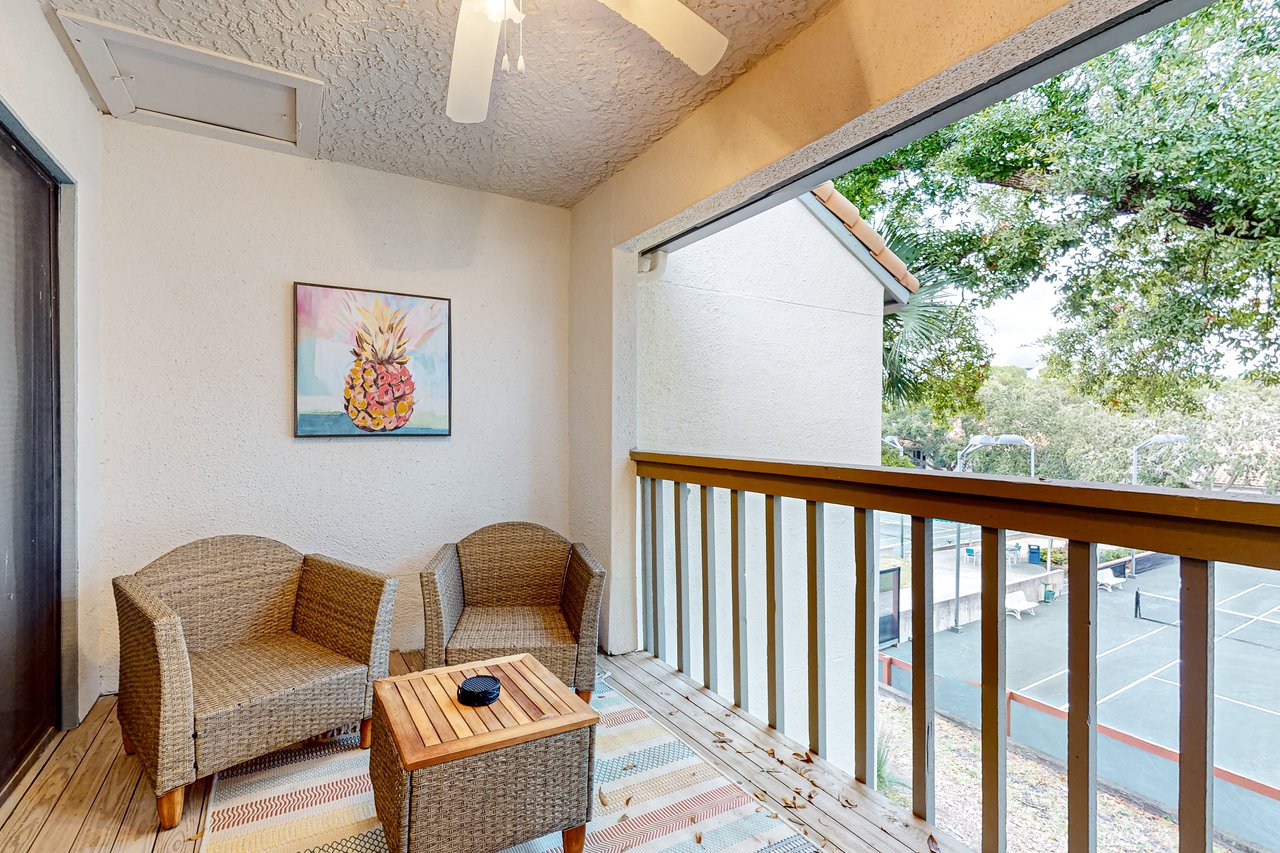 Inside, the condo features a bright, coastal-inspired interior that immediately feels welcoming. The open living areas provide plenty of space to gather, relax, and reconnect after days spent outdoors. A fully equipped kitchen offers ample room to prepare meals and snacks, which can be enjoyed together in the dedicated dining area. Upstairs, a covered balcony invites you to slow down and take in the warm coastal air, creating a peaceful spot for morning coffee or evening unwinding.