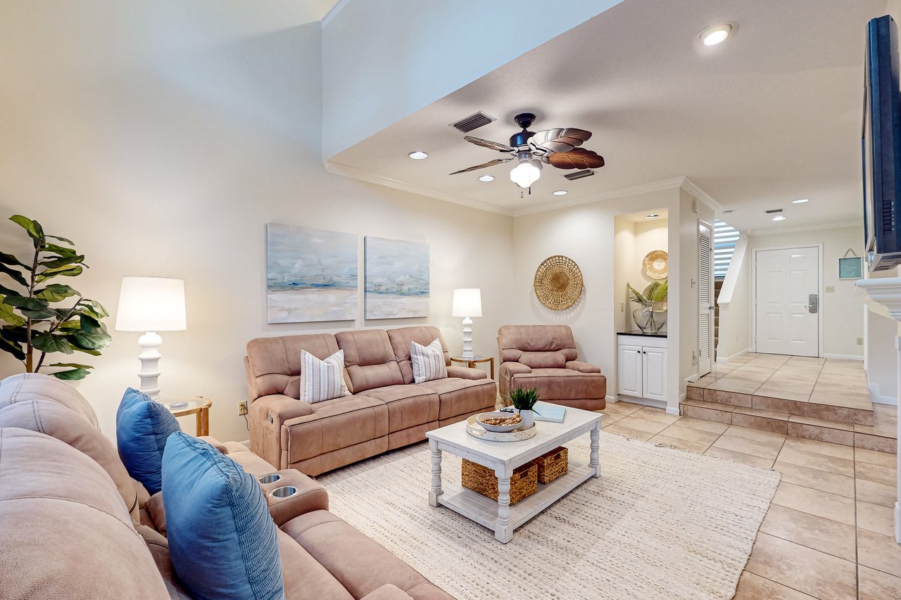 TOPS'L Tennis Village 54 by The Tops'l Lodging Company is a spacious two-bedroom, two-and-a-half-bath condominium offering a relaxed coastal retreat within a beautifully landscaped resort setting. With generous living space and a versatile layout that includes a loft, this residence is well suited for families or groups seeking comfort, room to spread out, and easy access to resort amenities. Inside, the condo features a bright, coastal-inspired interior that immediately feels welcoming. The open living areas provide plenty of space to gather, relax, and reconnect after days spent outdoors. A fully equipped kitchen offers ample room to prepare meals and snacks, which can be enjoyed together in the dedicated dining area. Upstairs, a covered balcony invites you to slow down and take in the warm coastal air, creating a peaceful spot for morning coffee or evening unwinding. The bedrooms are thoughtfully arranged to provide comfort and privacy, while the additional loft space adds flexibility for larger groups. With in-unit laundry and climate-controlled interiors, the home is designed to support a smooth, enjoyable stay from start to finish. Enjoy access to a wide range of resort amenities, including swimming pools, a hot tub, tennis and basketball courts, a fitness center, and a sauna, all woven seamlessly into the resort grounds. Shaded walking paths and convenient beach access complete the experience, allowing you to move easily between shoreline relaxation and resort recreation. TOPS'L Tennis Village 54 offers a well-rounded coastal escape centered on space, comfort, and resort-style living. Must be 25 years or older to rent.
