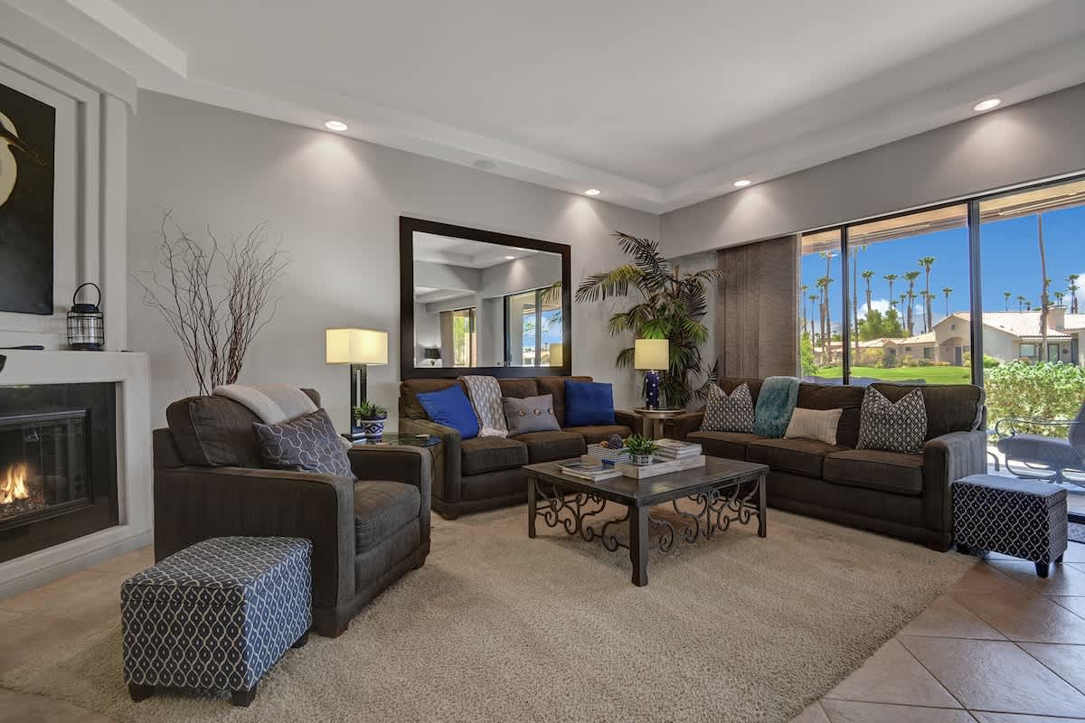 VB851 - Blue Bird - Alice Lodging License #STR2023-0547 This stylish single-level end unit has been fully remodeled with high-end finishes throughout and offers the perfect blend of comfort and sophistication. The open-concept living area features vaulted ceilings, recessed lighting, a cozy fireplace, and a convenient wet bar—ideal for relaxing or entertaining. The living room is complete with a large flat-screen TV and DVD player for your enjoyment. The remodeled kitchen is a showstopper, boasting new cabinetry, stainless steel appliances, granite countertops, and upgraded lighting. Just off the main living space, the den offers a comfortable sectional and a large wall-mounted TV, with doors that can be closed for added privacy—perfect for movie nights or additional guest space. Each of the three bathrooms has been beautifully updated with modern tile walk-in showers. The primary suite features a king bed, a bonus area with a desk for remote work, and a full en suite bath (no TV in the primary). The guest bedroom includes twin beds, ideal for family or friends. Tile flooring runs throughout the home, with soft carpeting in both bedrooms for added comfort. Step outside to the extended patio, complete with a built-in BBQ island and expansive fairway views—perfect for dining or lounging outdoors. A sparkling pool and spa are just a short stroll away, rounding out this exceptional desert retreat. Beds: Primary - King, Guest - 2 twins. CLUB ACCESS: Palm Valley is an upscale, private country club. Renter access to club facilities is dependent upon the membership status of the property owner. For this property, renters will have pay-per-use access to the dining facilities, day spa and hair salon only. Numerous fine golf courses with public access are located nearby. Forty-six community swimming pools are available to renters. Per local ordinance, all guests are presented local Good Neighbor Policies to abide by during their stay. A copy of these policies will be sent upon confirmation of your reservation. Please note that the person paying for the reservation needs to be the one checking in and the same person must stay in the home throughout the reservation.